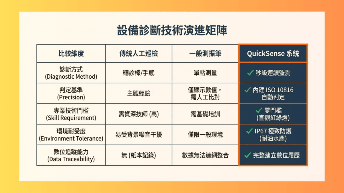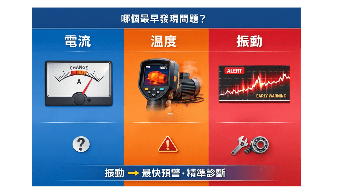 - 最快發現問題:在問題轉化為顯著摩擦、熱量或負荷變化之前,振動已經告訴我們「有東西不對勁了」。
